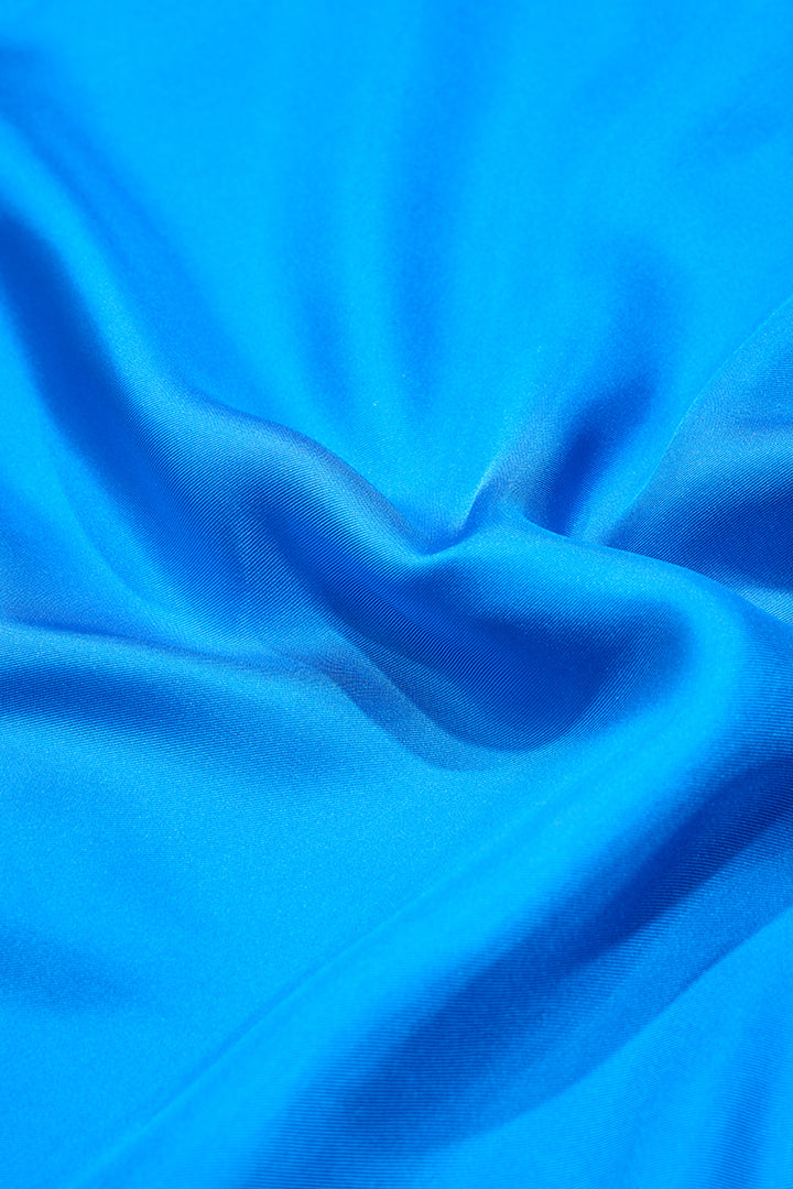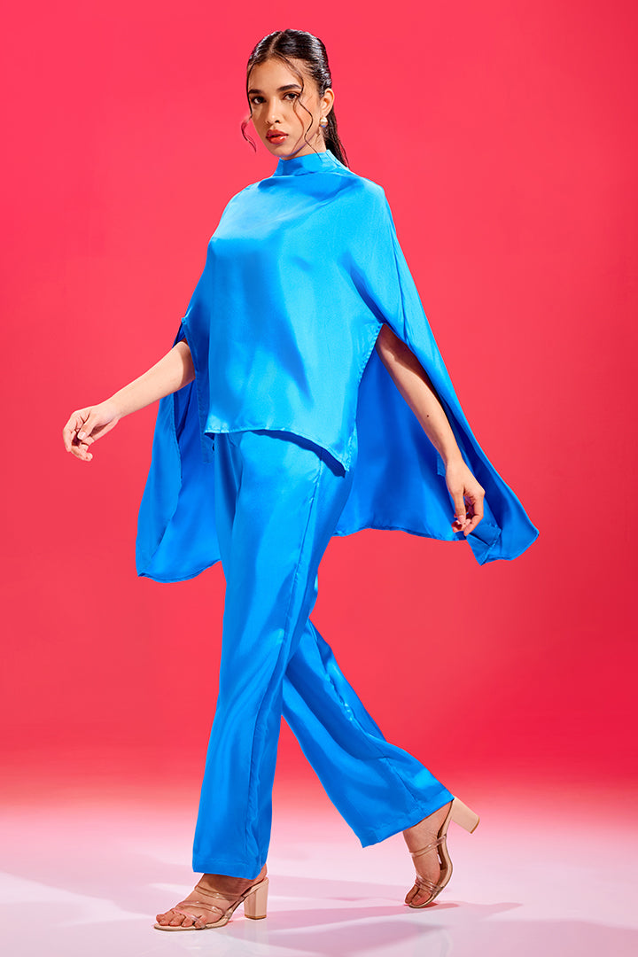 This chic two-piece ensemble is designed for effortless impact in dazzling Electric Cobalt. The set features a modern, high-neck top with a dramatic, flowy put-on silhouette that drapes beautifully over the shoulders. Both pieces are crafted from luxurious premium Satin, offering a fluid look and comfortable fit. Paired with tailored, straight-fit pants, this set is perfect for sophisticated evening comfort.