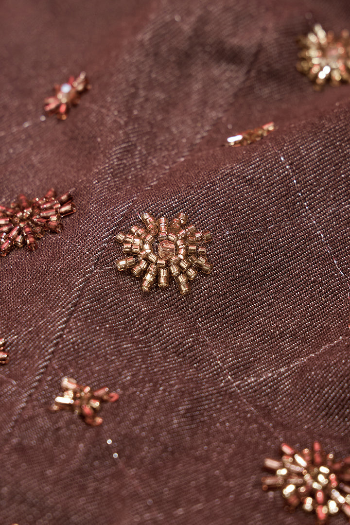 Fashion-forward mini skirt with an asymmetrical scoop hem and structured V-neck sleeveless top, crafted from Deep Espresso Brown denim. The set is elevated by all-over hand embroidery featuring shimmering gold and bronze sequins in an abstract pattern.