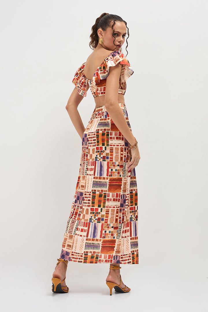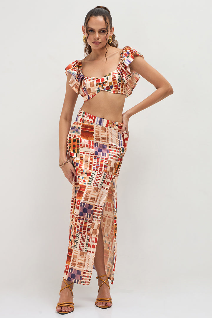 This is a vibrant co-ord set crafted from luxurious Modal Satin fabric with a captivating Multi Color Abstract Print. Features a ruffled sleeve crop top with shaped bottom hem and high slit ankle-length skirt for an elegant silhouette. Perfect for daytime events, summer parties, or casual outings. Comfortable fabric and vibrant print make it versatile for both relaxed and dressier occasions.