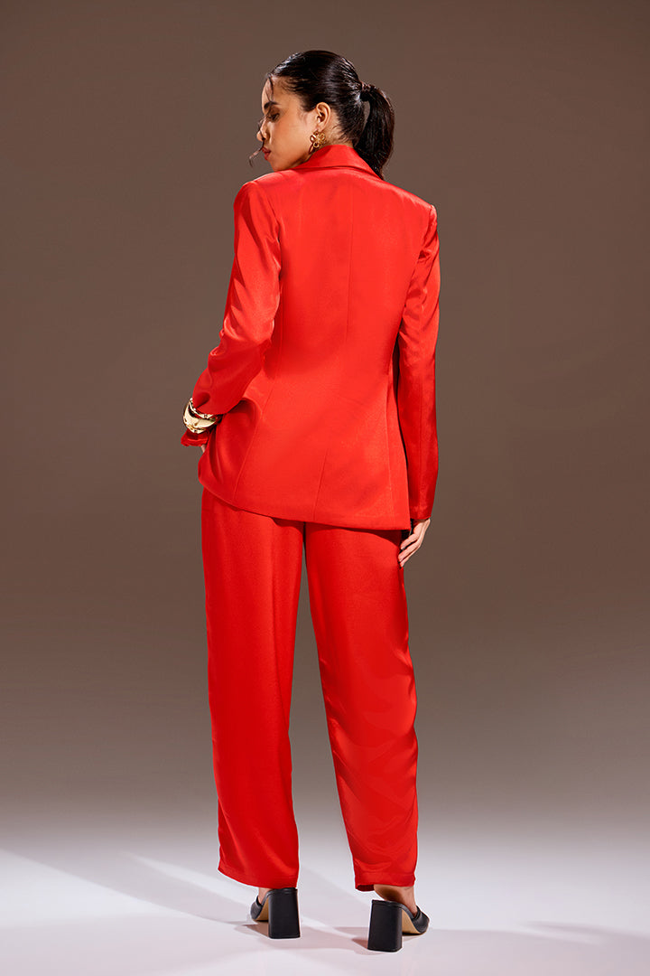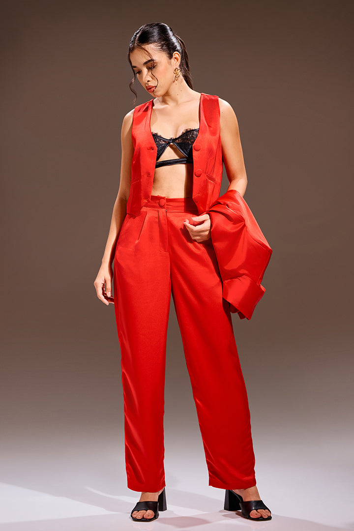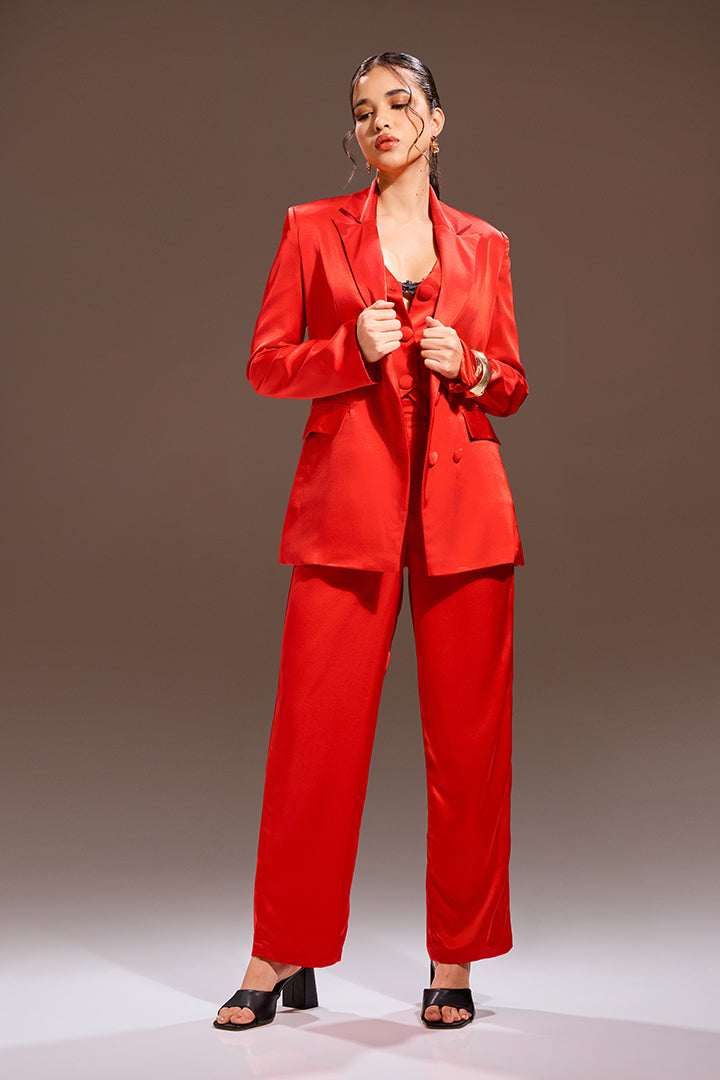 This striking four-piece ensemble is tailored in luxurious, deep Crimson Red, creating the ultimate power statement. The set includes a perfectly draped blazer, a fitted inner vest, and relaxed-fit trousers. Completing the look is an inner bralette crafted from delicate lace fabric, adding a subtle layer of sensuality. This confident look is designed for those polished moments when commanding attention is essential.