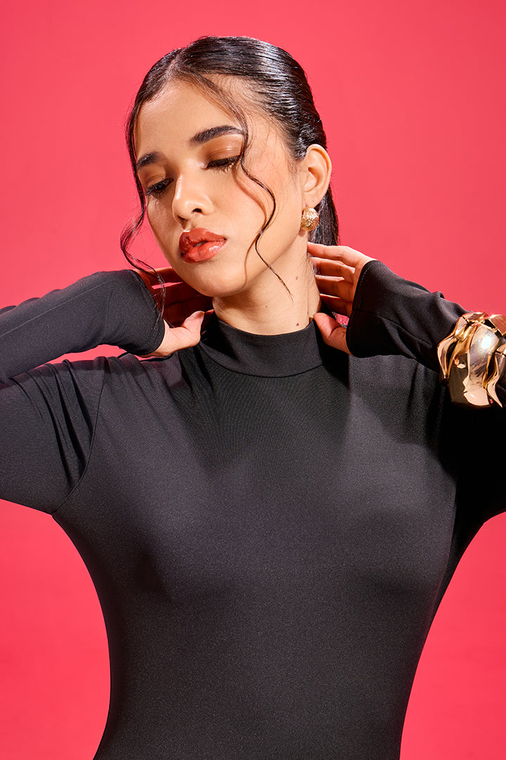 This gown embodies timeless elegance, crafted from premium Jersey fabric that drapes and sculpts the figure flawlessly. Designed in rich Pitch Black, it features a sophisticated high-neckline and full sleeves, creating a refined and powerful silhouette. Though covered, the floor-length cut offers maximum sleekness, making it a highly chic and essential wardrobe foundation.