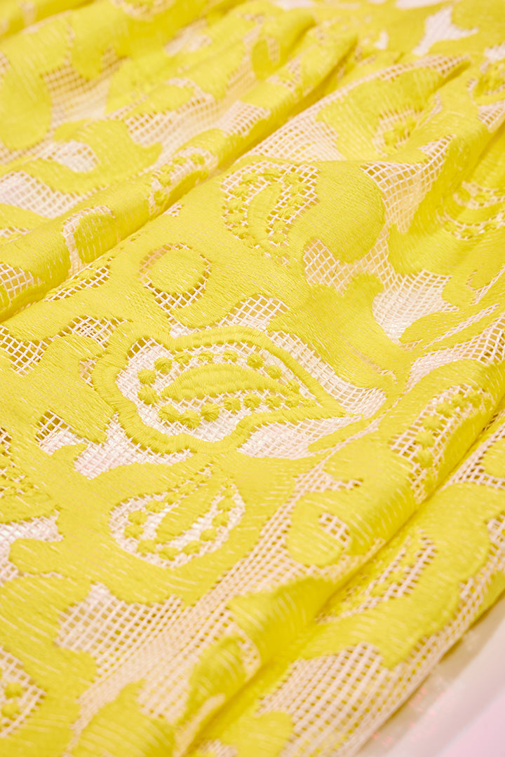 This striking two-piece set is crafted from a vibrant Zesty Lemon Jacquard fabric, featuring an intricate, woven pattern that gives the garment a unique, structured dimension. The set includes a sophisticated cropped top and a full, flowing skirt that is fitted at the waist, creating a dramatic A-line silhouette. This contemporary and vibrant look is perfect for making a bold fashion statement at special events.
