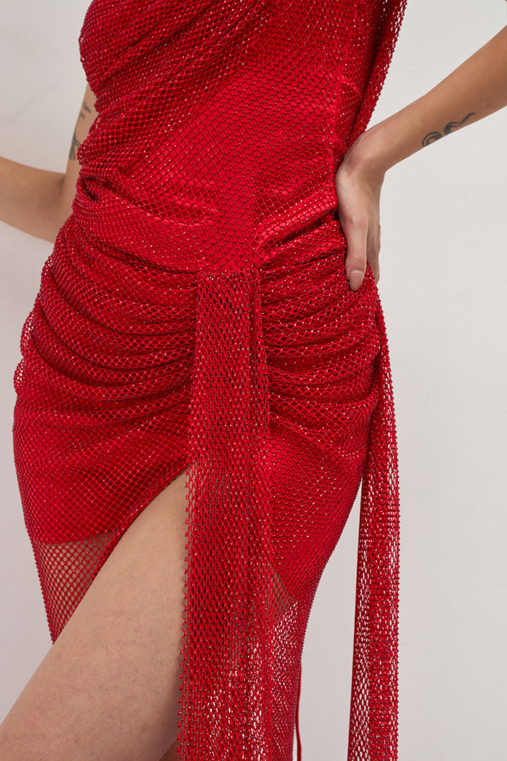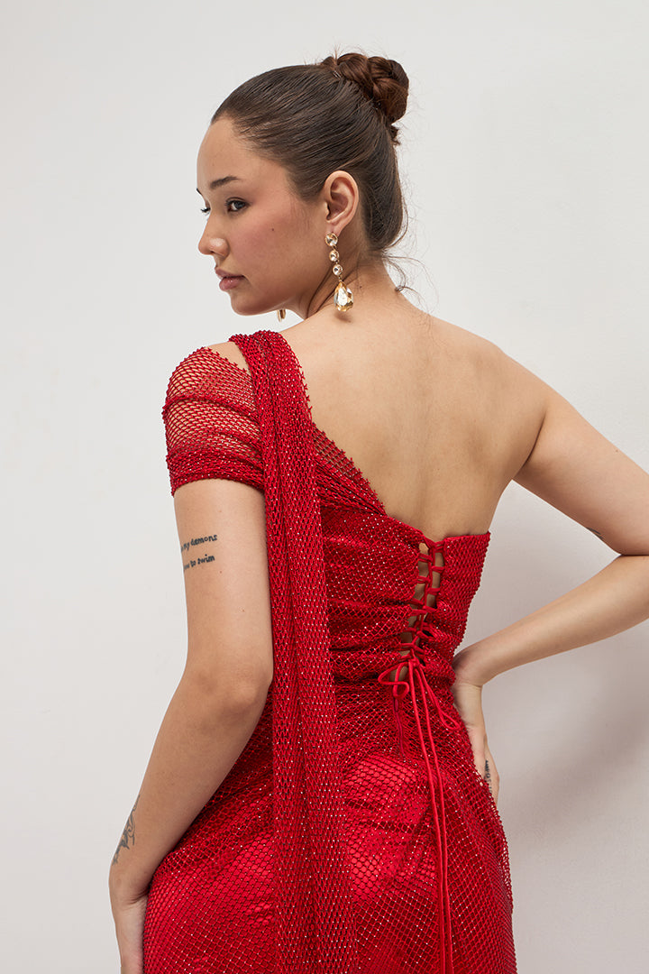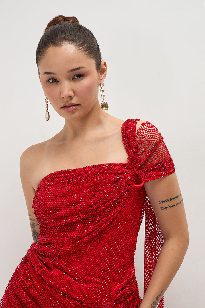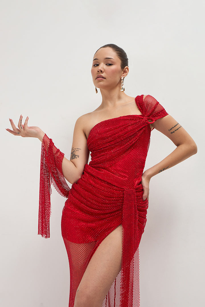 A one-shoulder fitted gown in rhinestone mesh over satin, featuring a sleek body-hugging silhouette with a thigh-high slit. In a striking Ruby red, this statement piece is perfect for cocktail nights, evening parties, and red-carpet events.