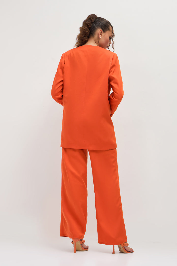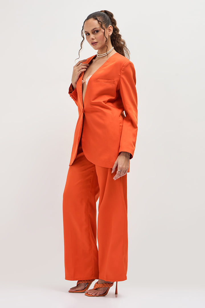 Oversized rust orange blazer paired with wide-leg trousers, styled with a delicate peach lace bralette. A relaxed yet fashion-forward set, perfect for stylish gatherings and evening parties