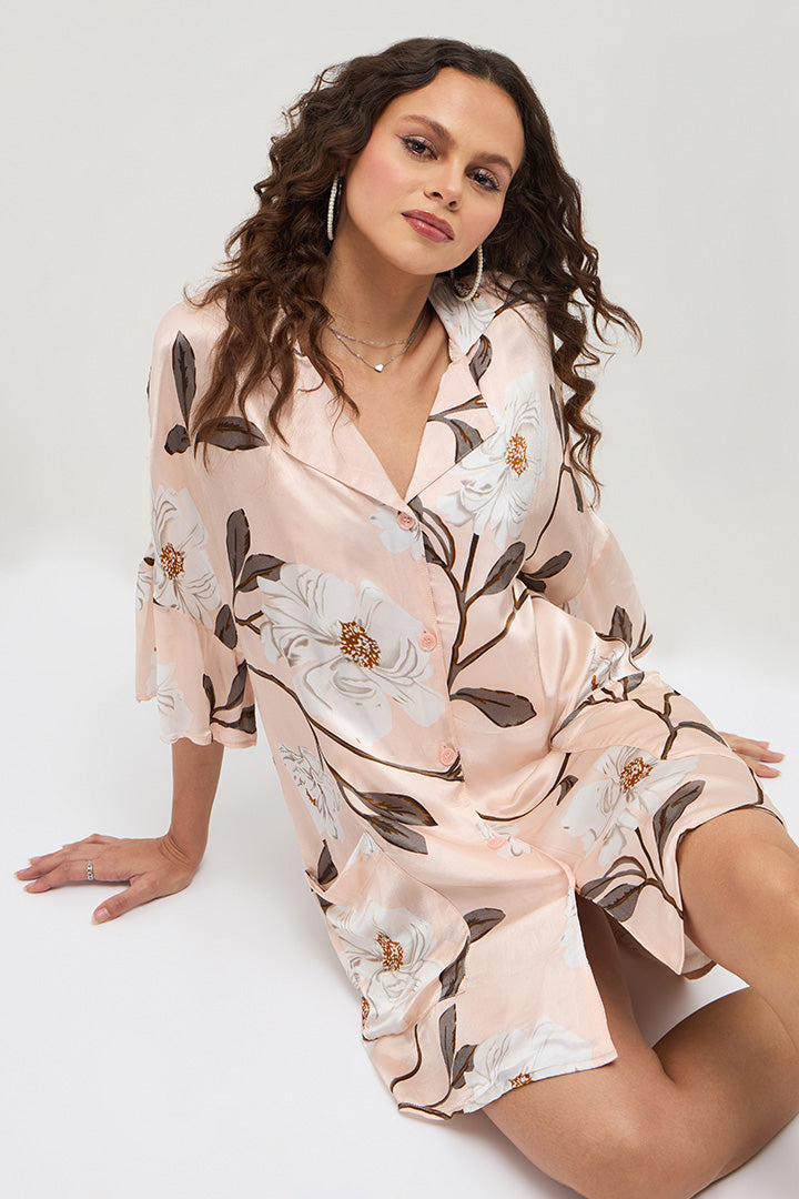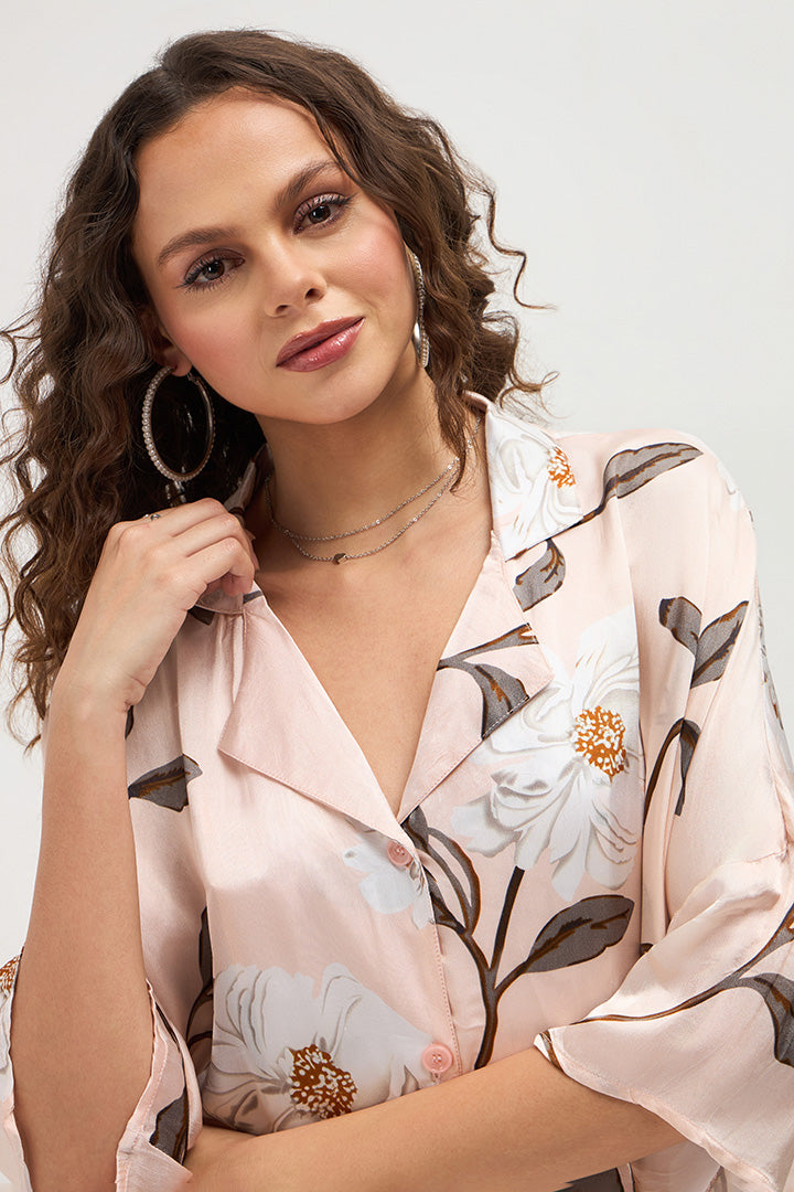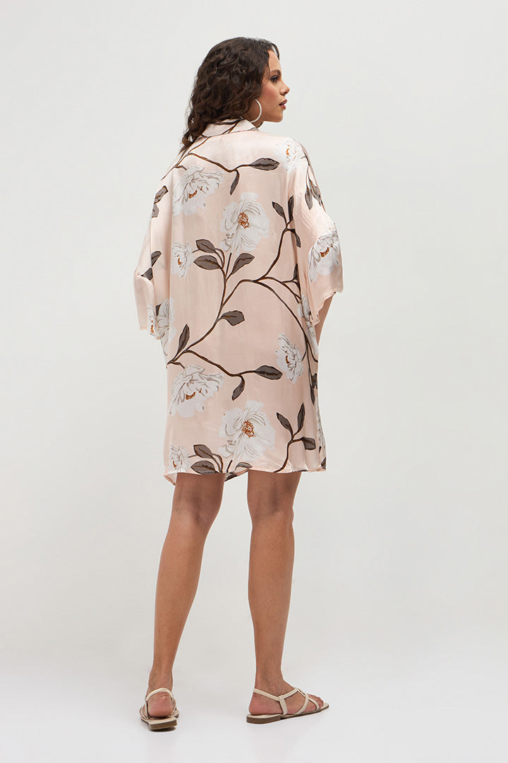 Made from luxurious peach satin fabric with stunning dark grey and white floral print. Featuring an oversized fit and versatile design, the Handara can be worn as a dress or as a kimono over your favorite swimwear.