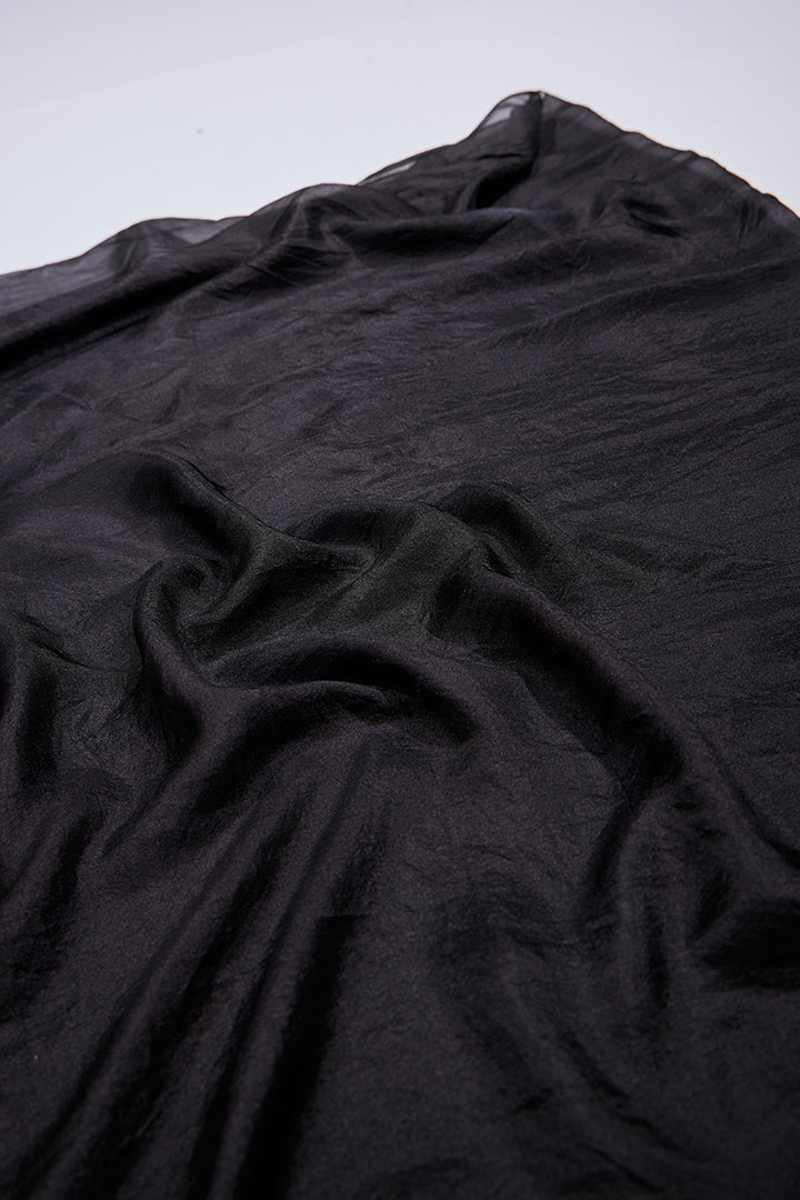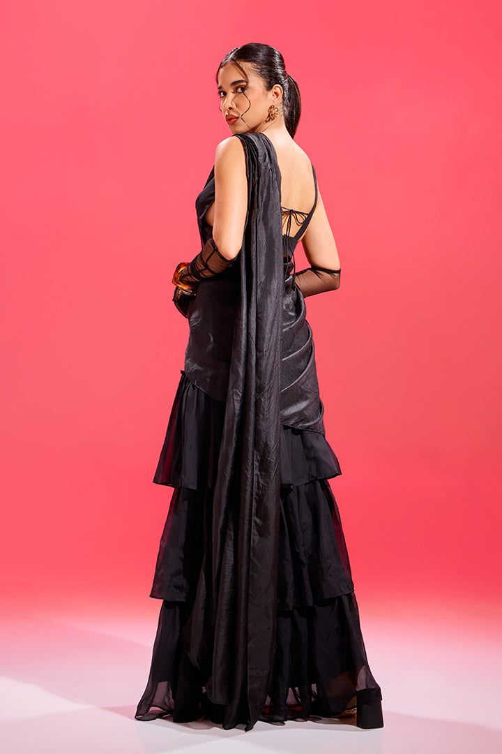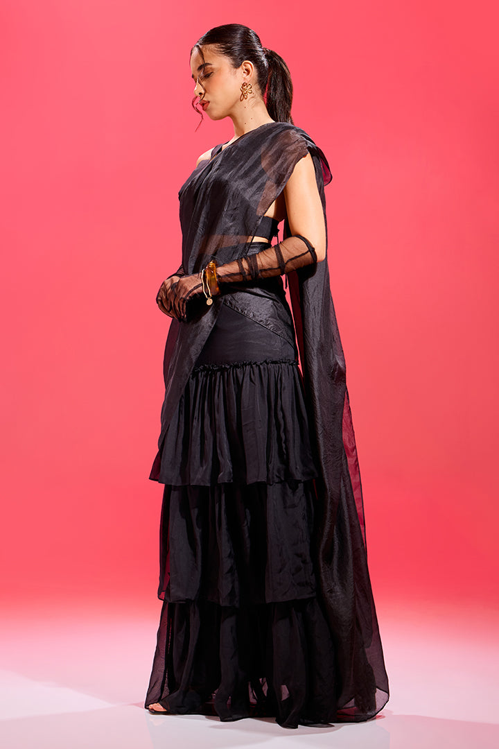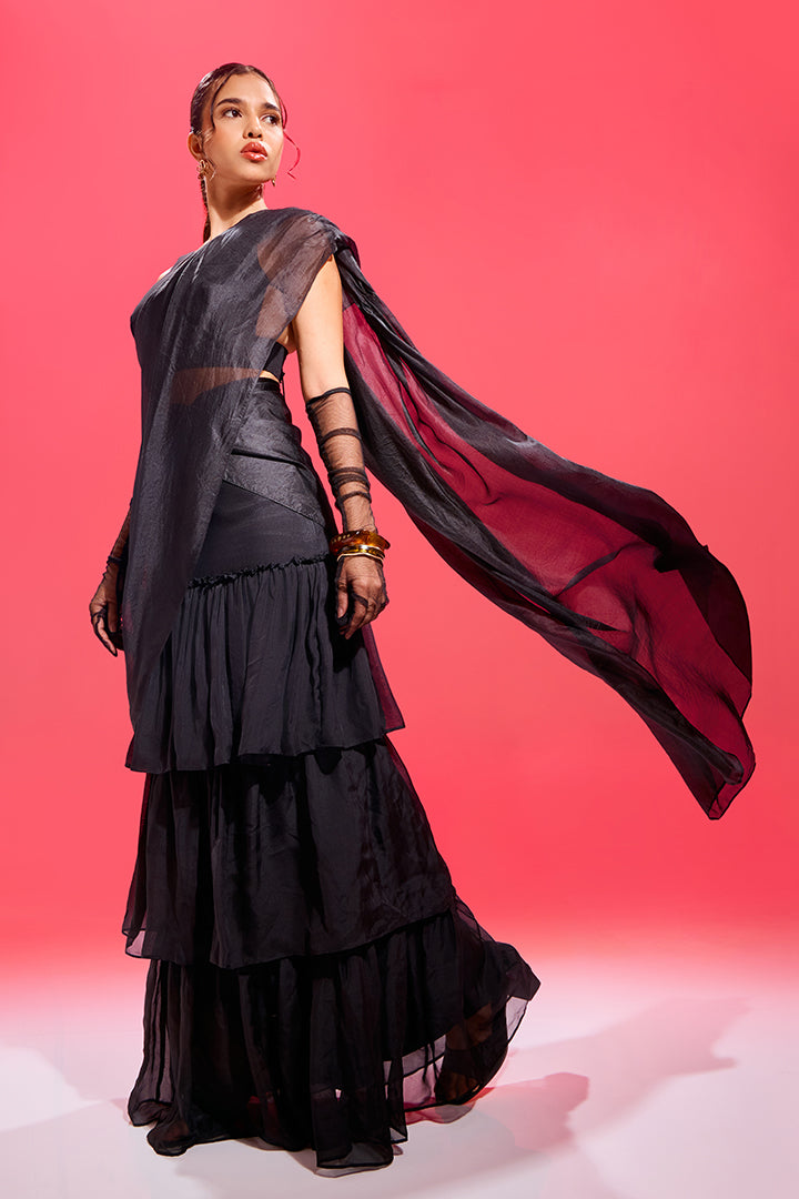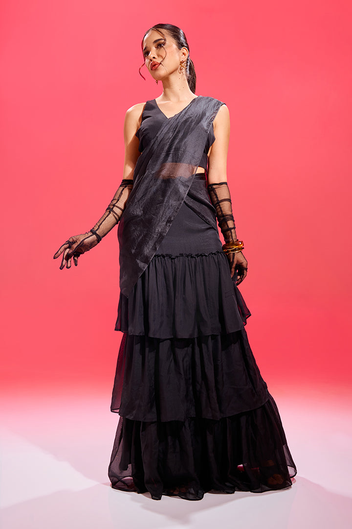 This captivating ensemble reimagines traditional elegance with a modern edge, all in sophisticated Cosmic Black. It features a gracefully draped saree crafted from luxurious Silk Chiffon, flowing into a dramatic ruffled skirt. A sleek sleeveless blouse complements the look, elevated by chic net gloves that add a touch of contemporary allure. Perfect for making a statement at any exclusive event.