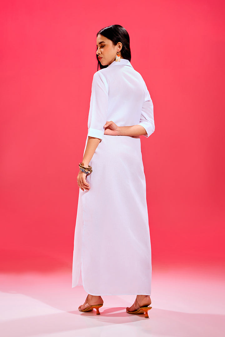 This effortlessly chic midi shirtdress is crafted from crisp, breathable 100% cotton in a timeless white shade. Featuring a classic collared neckline, elbow-length sleeves, and a subtle side-slit for ease of movement. Perfect for elevated daytime styling and casual chic moments.