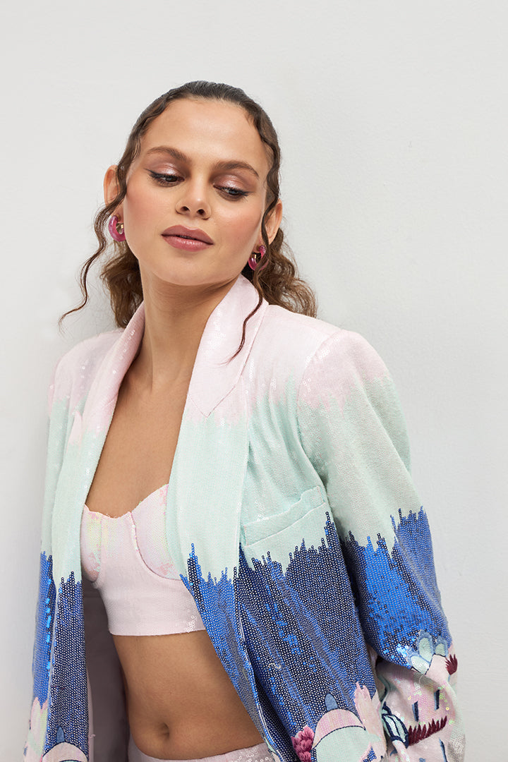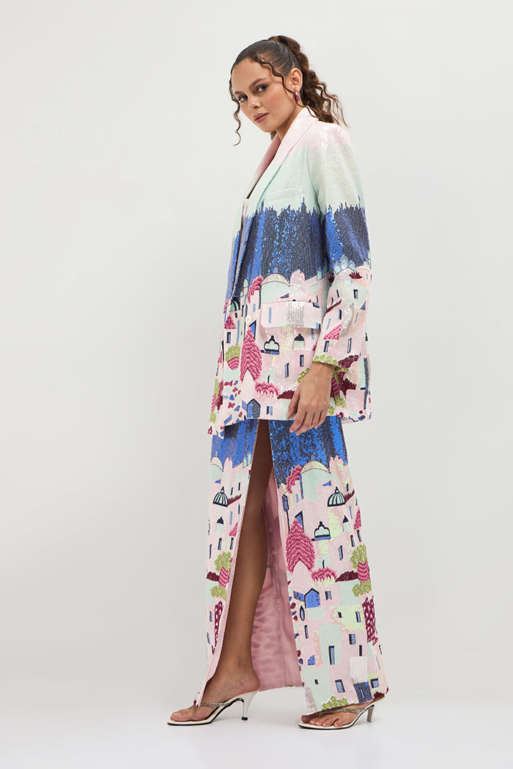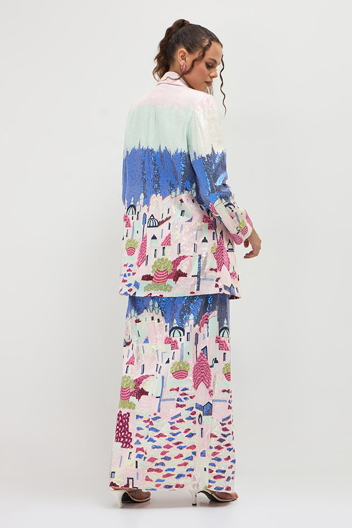This is a stunning georgette-based digital print sequin co-ords skirt, top, and blazer set that tells a story of its own. The delicate beaded accents and sequin embellishments on the top, paired with the graceful flow of the midi skirt, create a look that exudes elegance and sophistication.