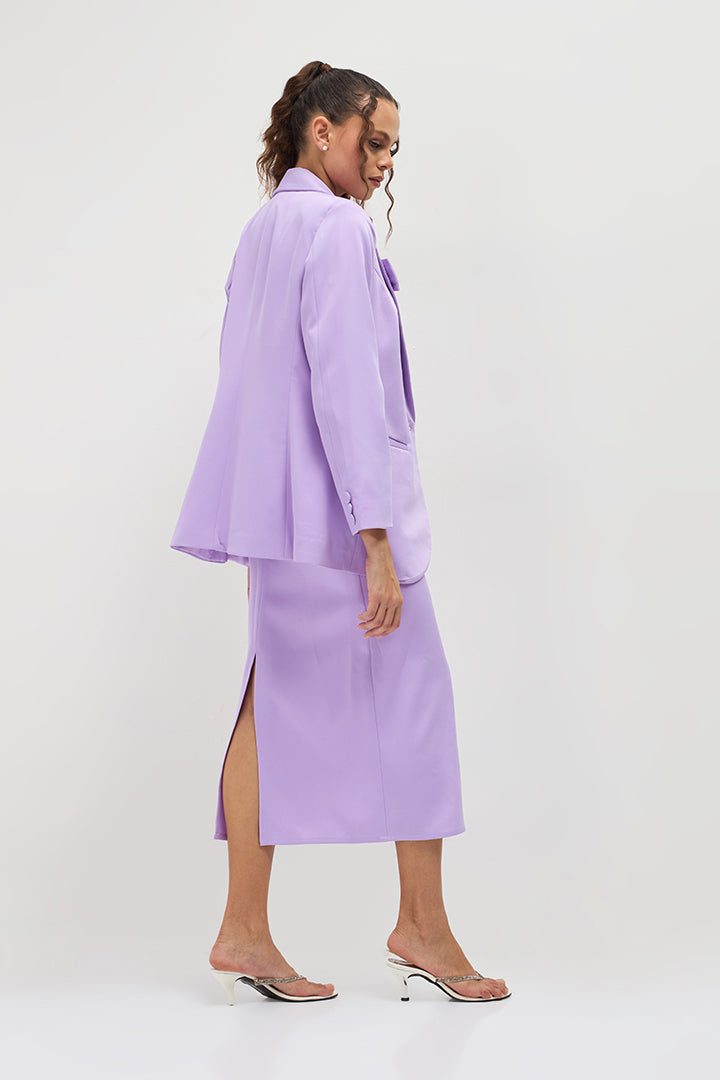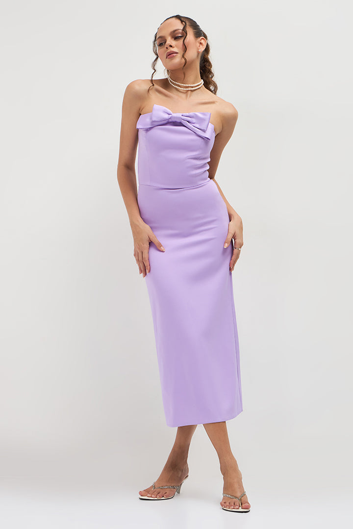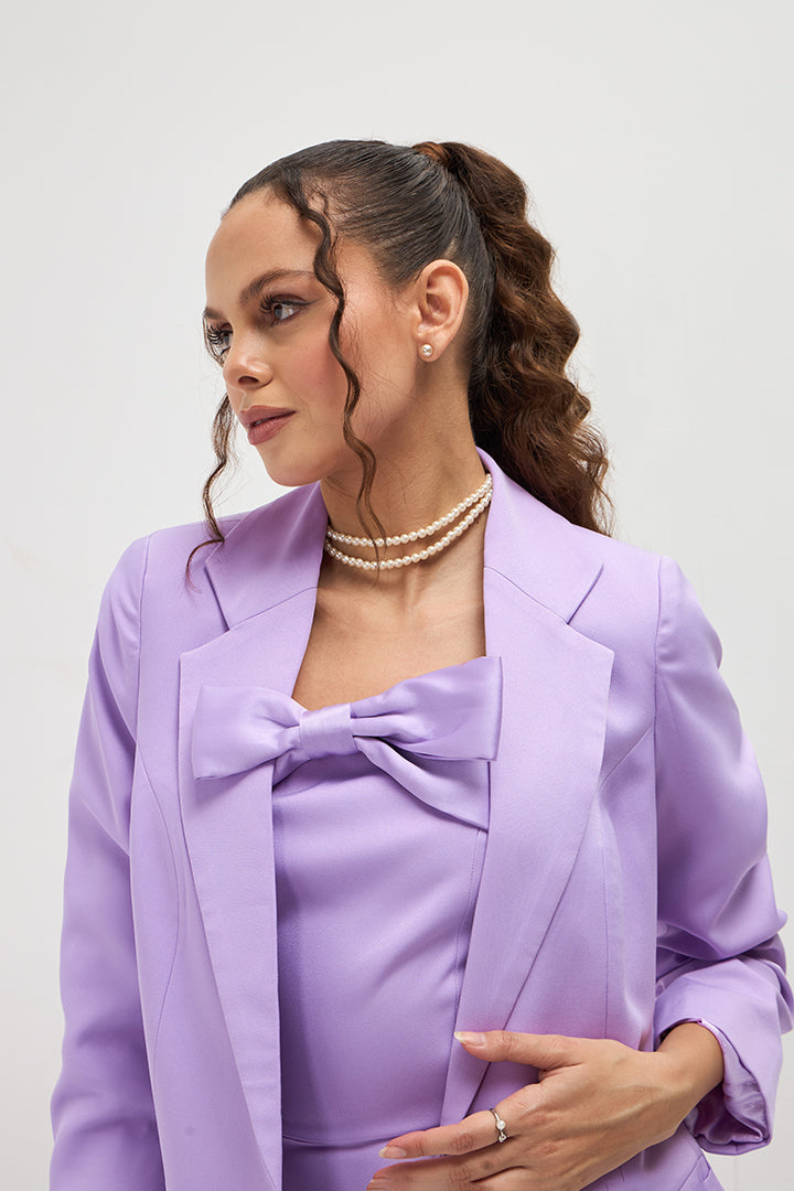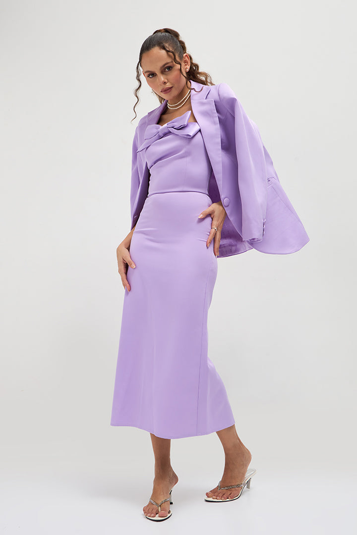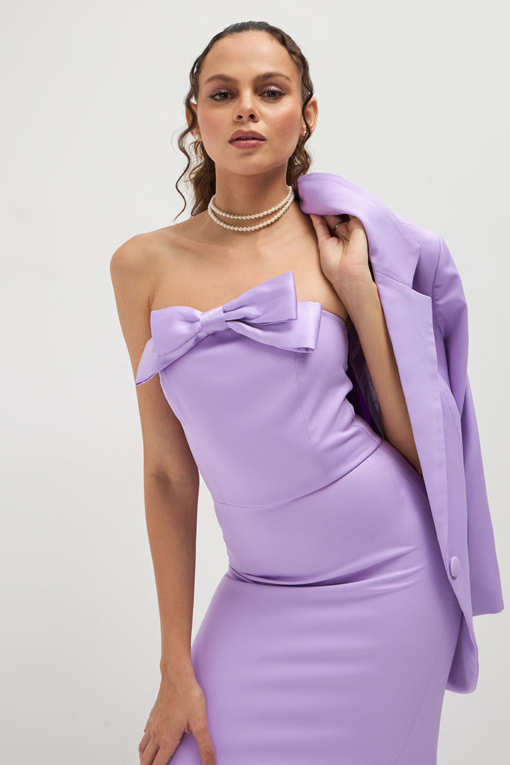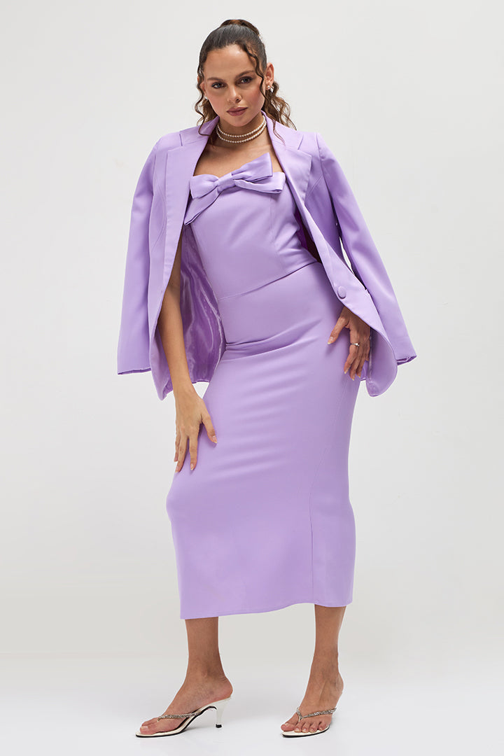 A shoulder-baring fitted dress styled with an oversized blazer, finished with a satin bow accent. Crafted in premium banana crepe with satin detailing in a soft Lilac Mist shade. A versatile look perfect for evening parties, brunches, or stylish gatherings.