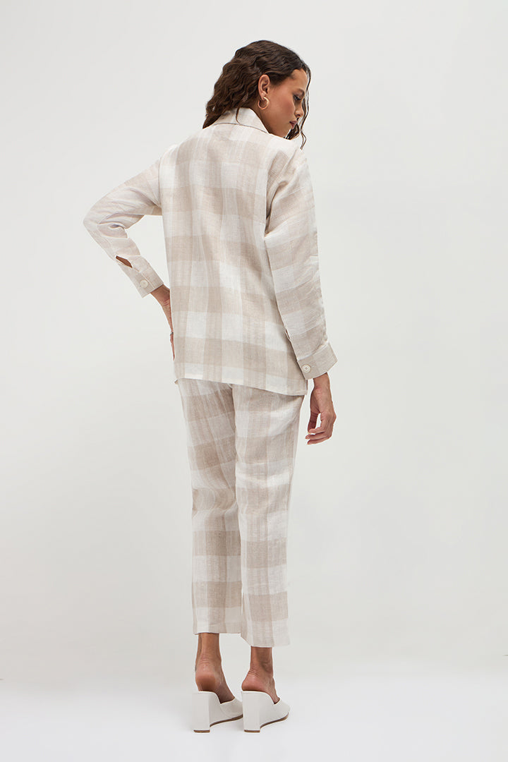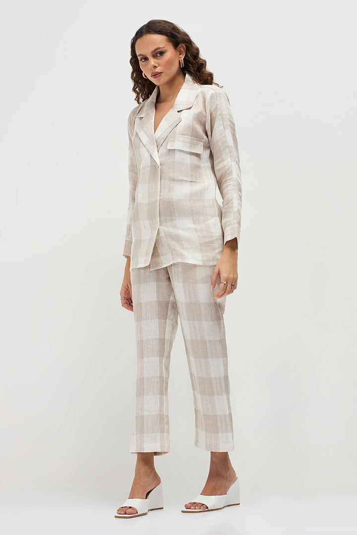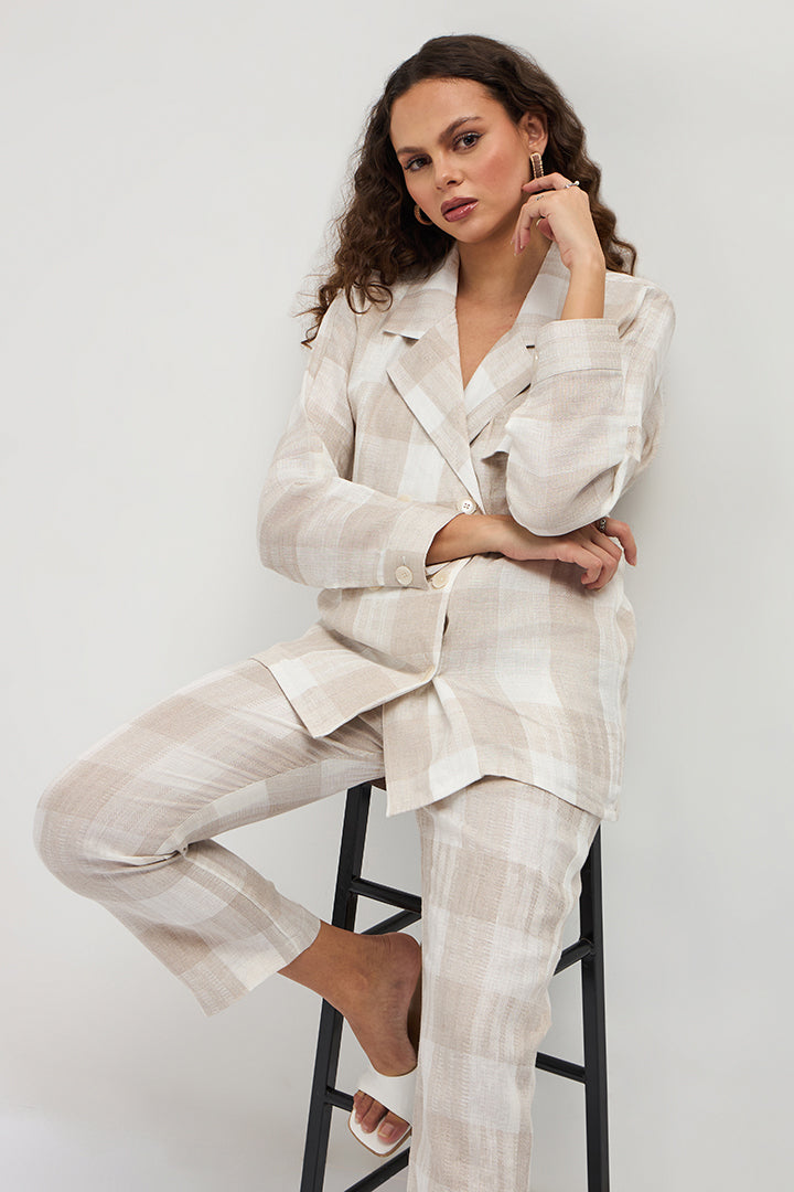 This breezy double-breasted shirt features a bold plaid pattern, paired with straight-fit trousers for a clean, tailored look. The ensemble exudes effortless sophistication, perfect for smart-casual occasions or chic daytime styling.
