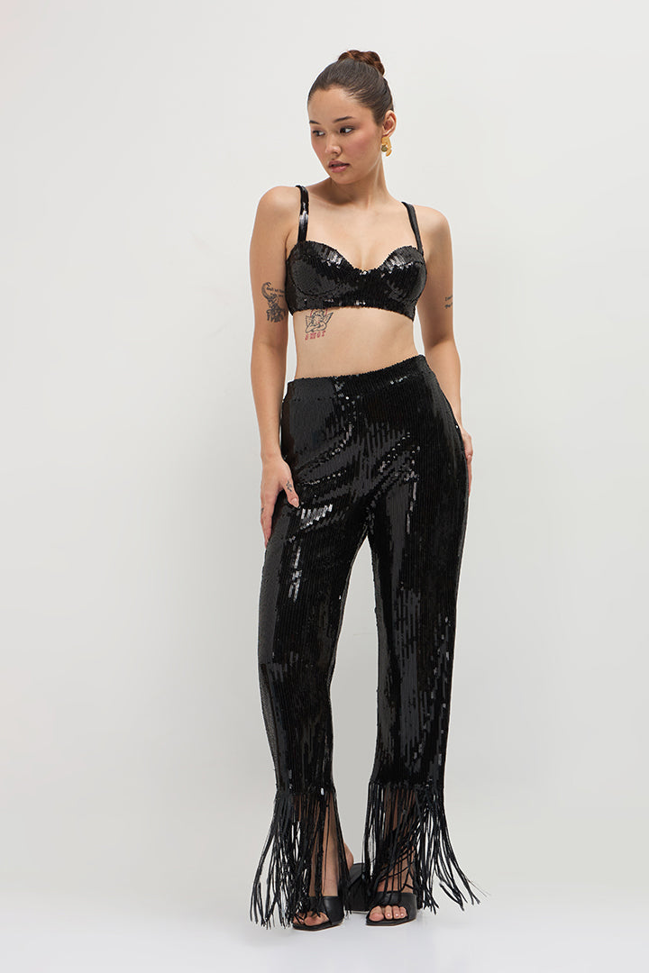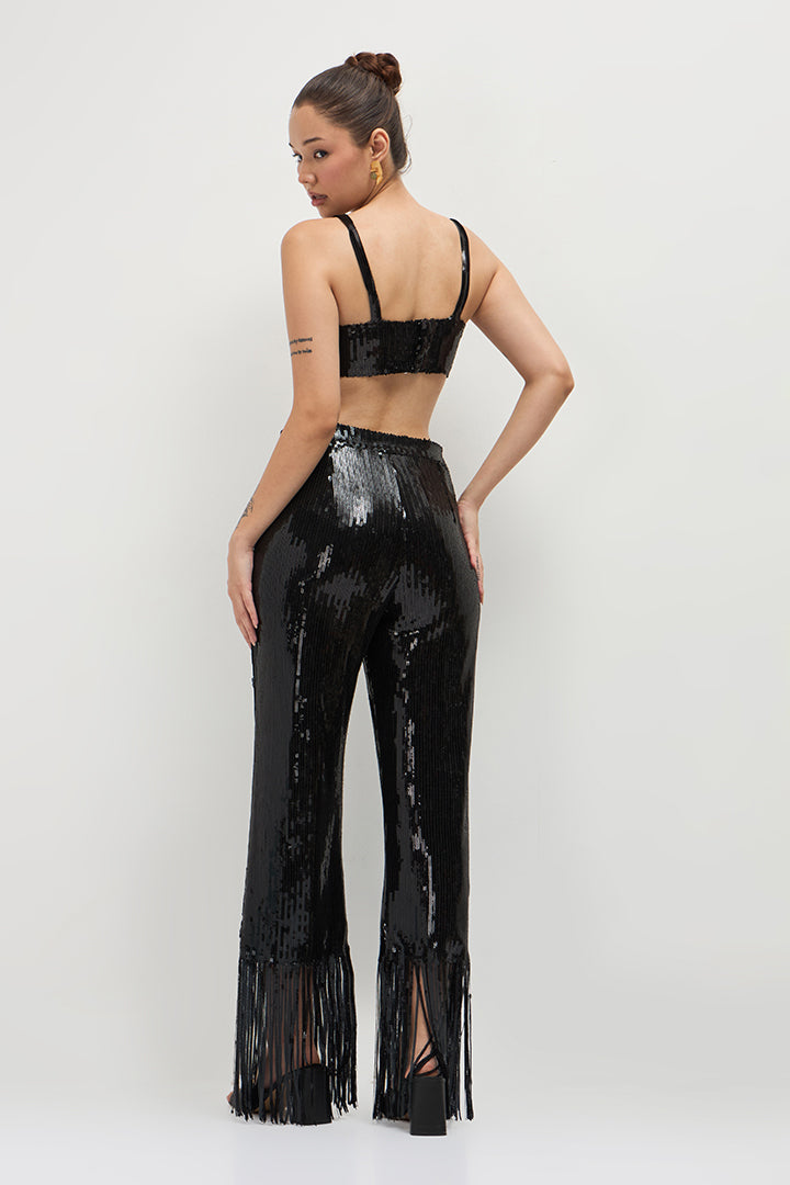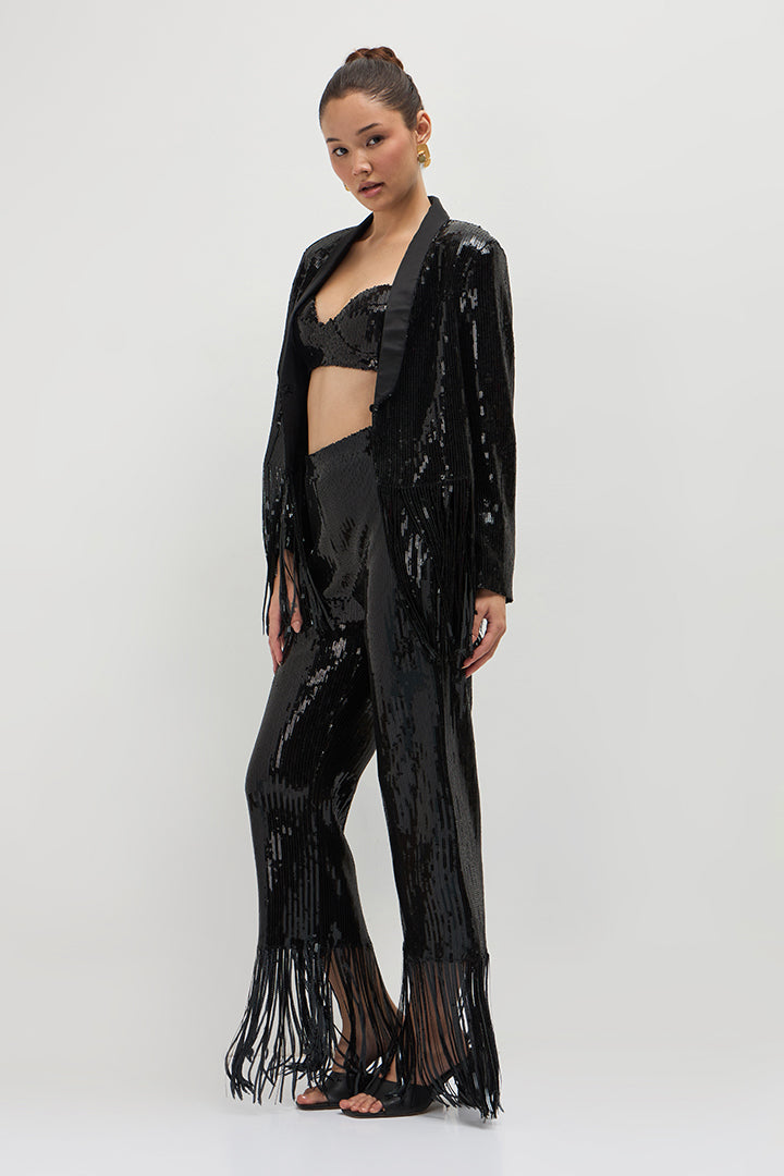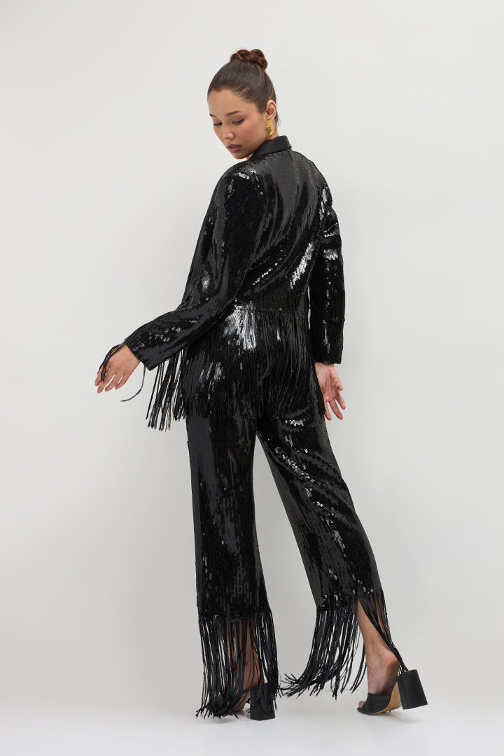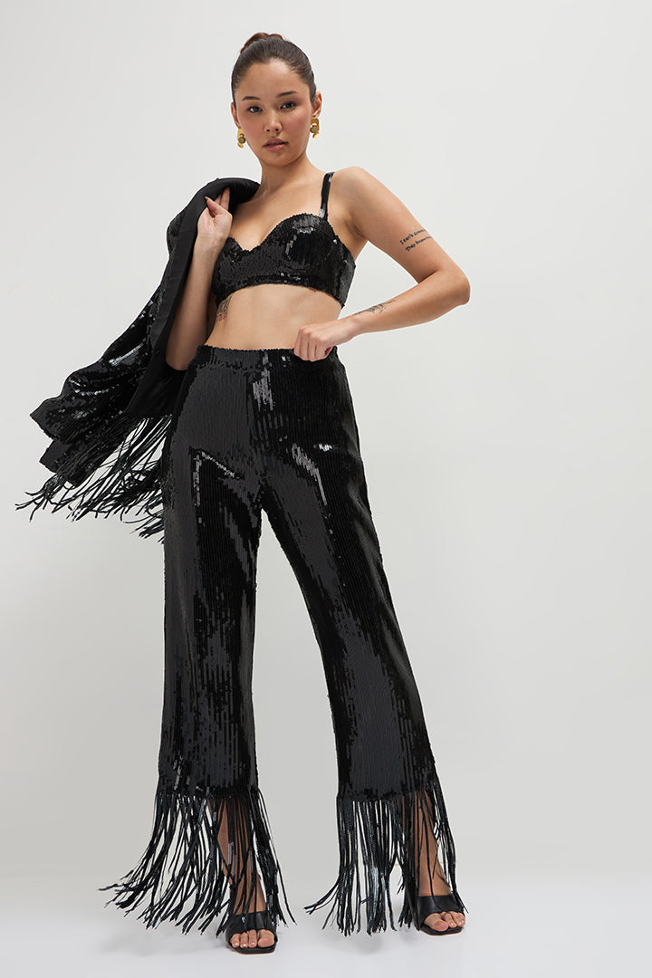 Make a bold statement with this co-ords, showcasing a dazzling bustier-style sequin crop top paired with tassel-adorned pant & skirt in shimmering midnight black. The crop top features exquisite detailing and flattering silhouette. The look is elevated by a stylish sequin blazer with satin lapel collar and sequined tassel accents at the sleeves, adding sophistication and drama ideal for high-profile events. Offers flexibility to be worn as complete set or mixed with other wardrobe staples.