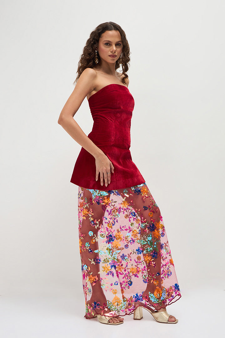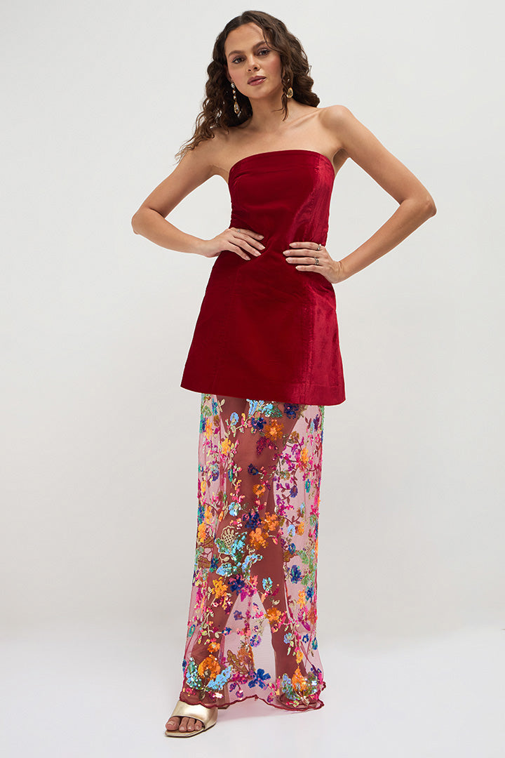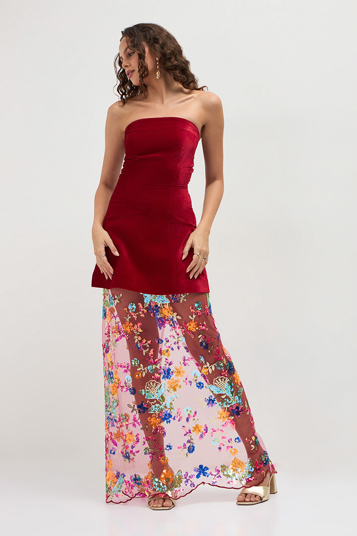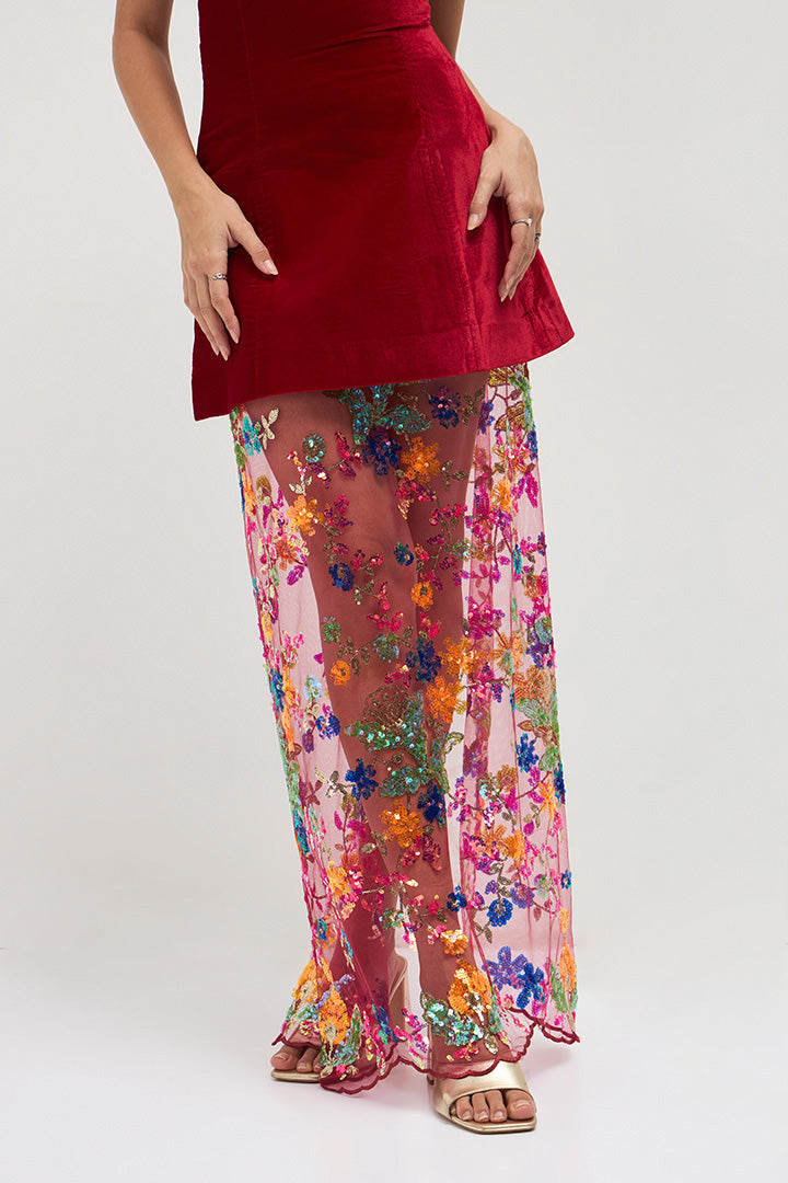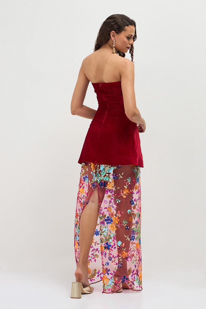 This dress features a velvet bodice with a flattering fit. The skirt is adorned with multi-color sequin embroidery in a sheer style. Its elegant pattern blends classic and modern appeal.