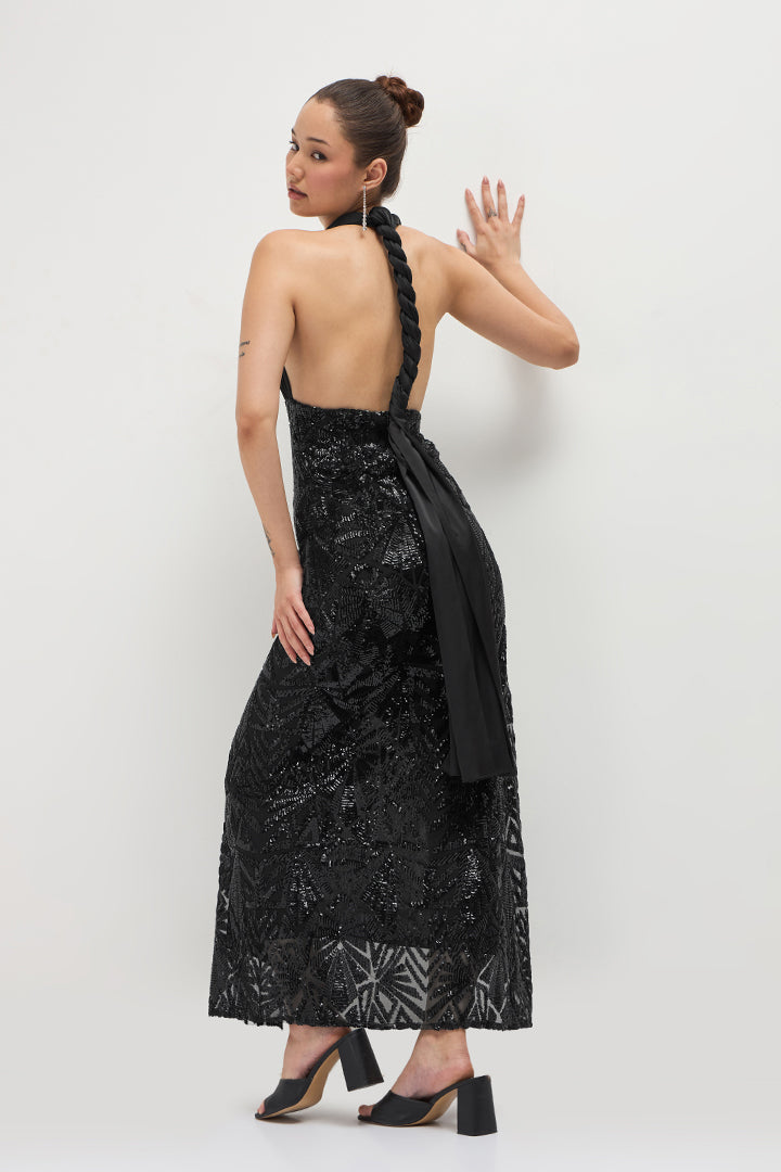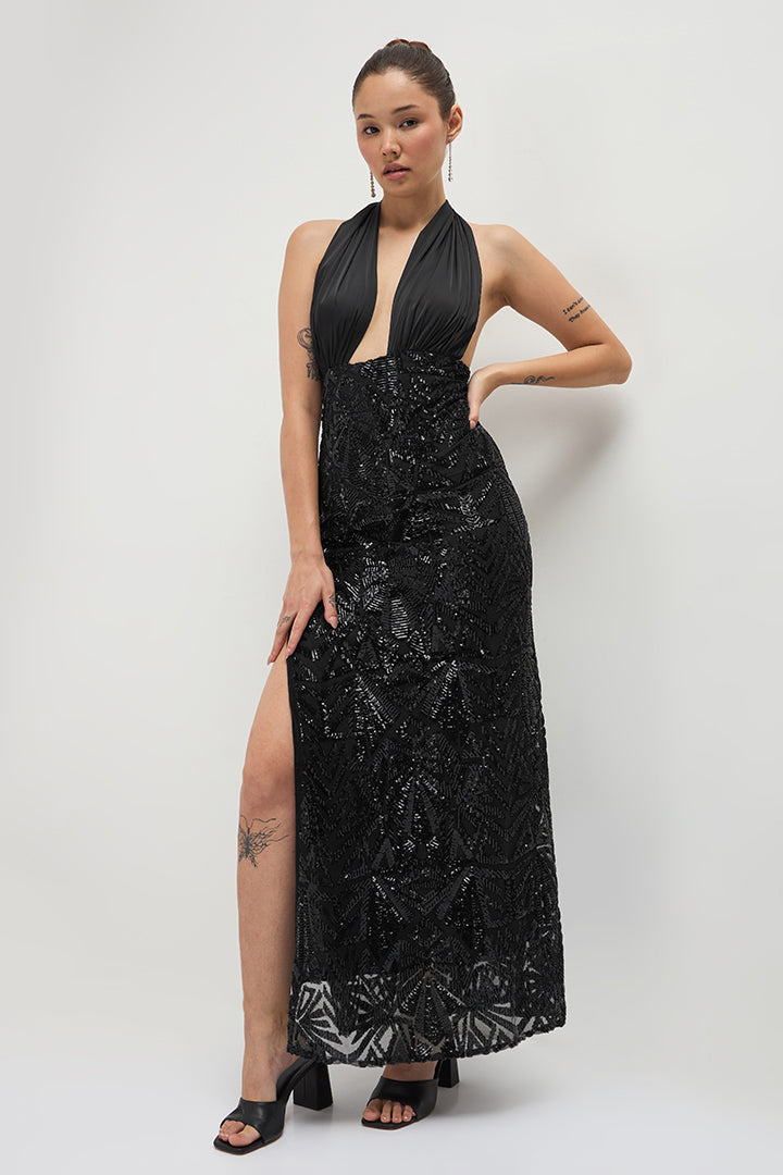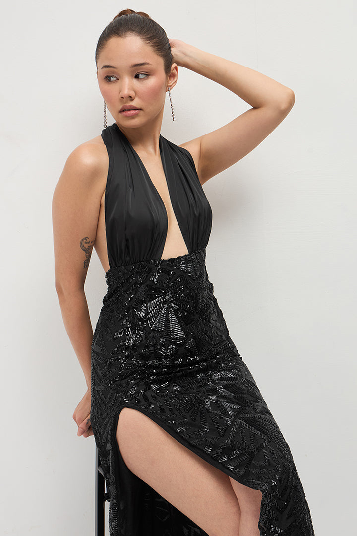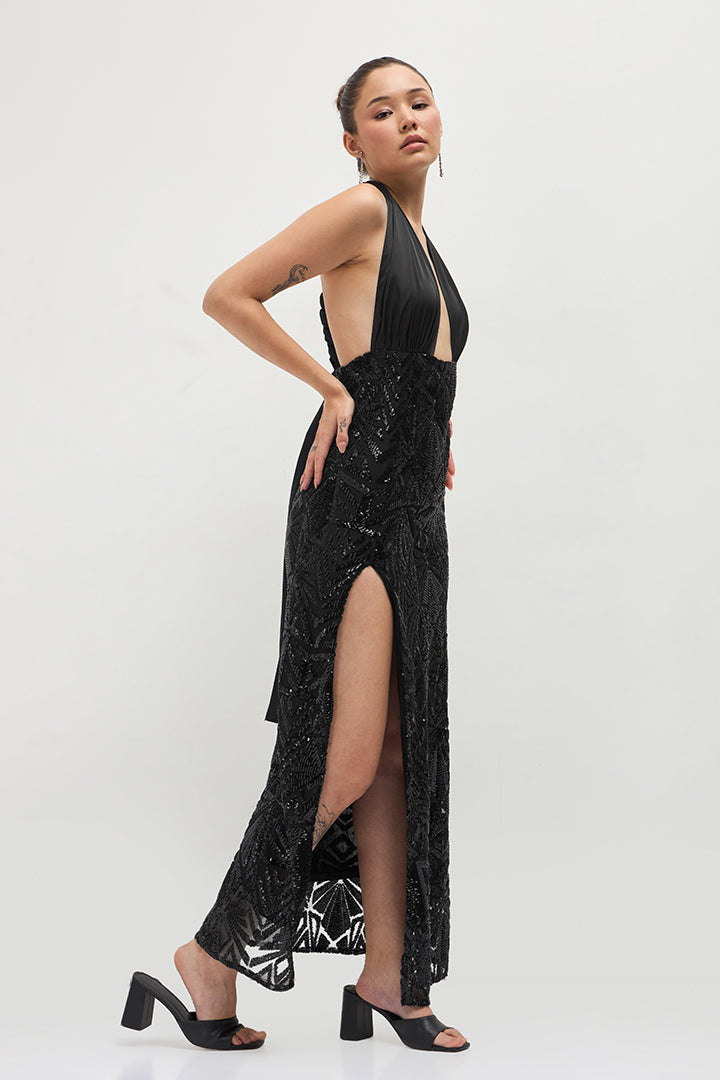 This is a mesmerizing evening dress crafted from Sequin Embroidery Net and Poly Satin fabrics in vintage black. The sequin embroidered net creates a glamorous visual effect that catches the light beautifully. Perfect for formal events, galas, or black-tie affairs. This timeless gown combines intricate detailing with luxurious fabrics for a truly showstopping look.