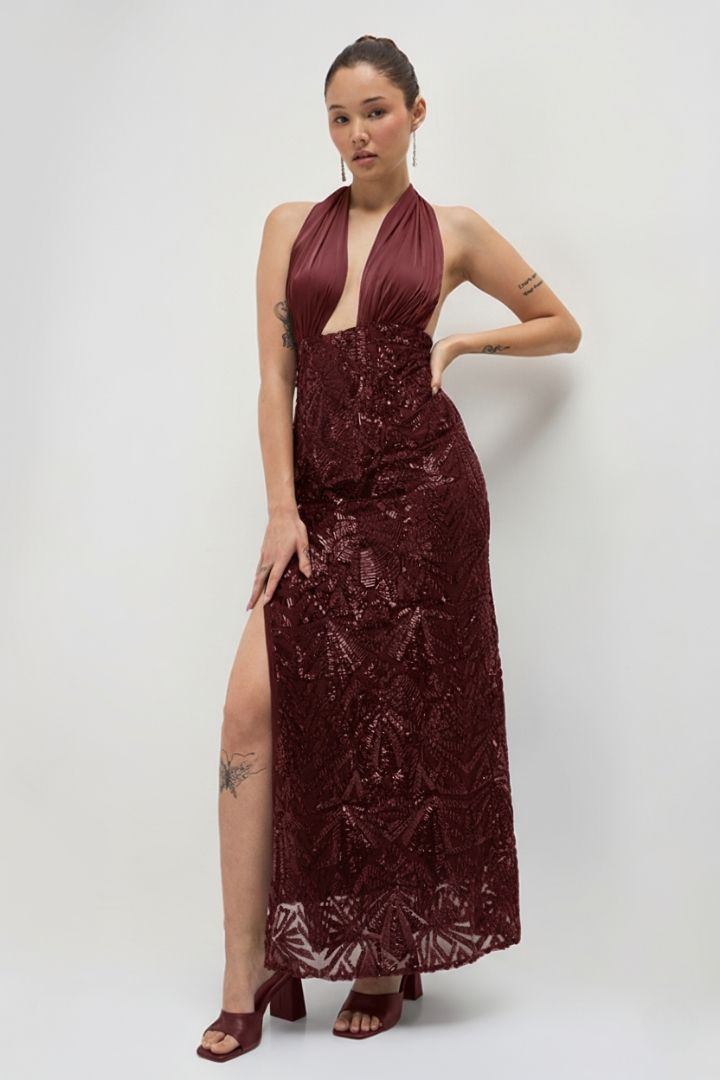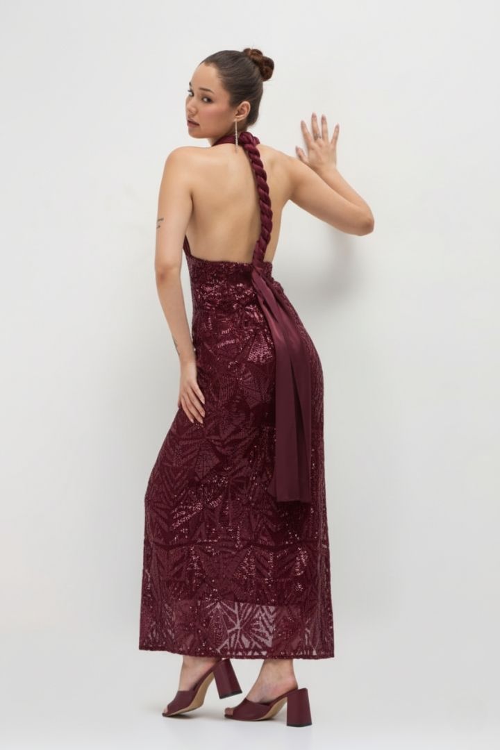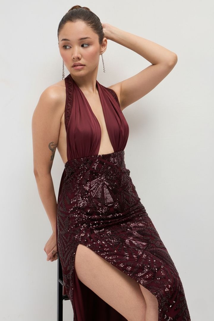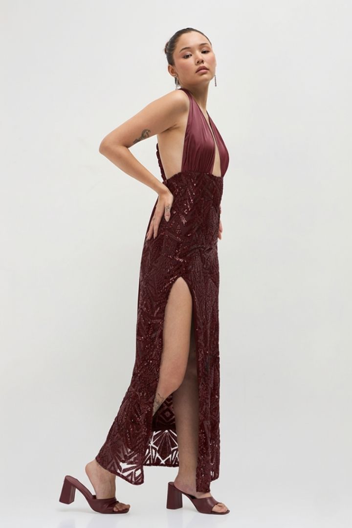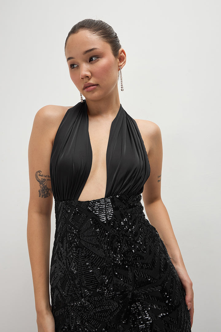 This is a mesmerizing evening dress crafted from Sequin Embroidery Net and Poly Satin fabrics in vintage black. The sequin embroidered net creates a glamorous visual effect that catches the light beautifully. Perfect for formal events, galas, or black-tie affairs. This timeless gown combines intricate detailing with luxurious fabrics for a truly showstopping look.
