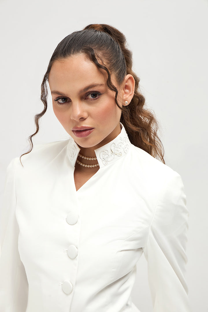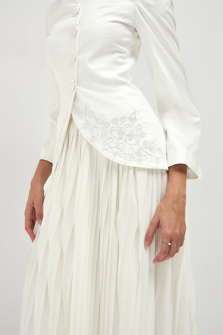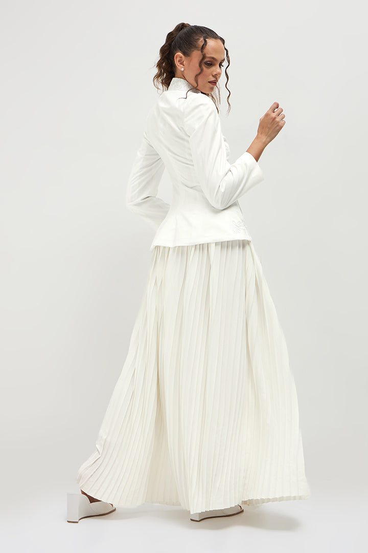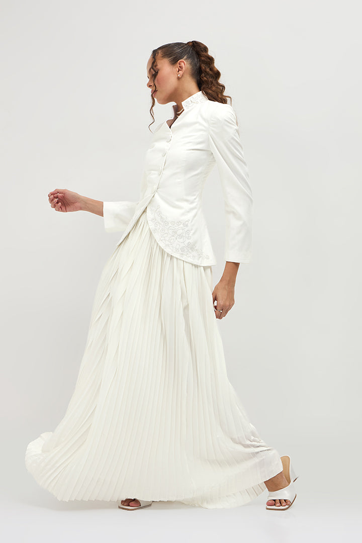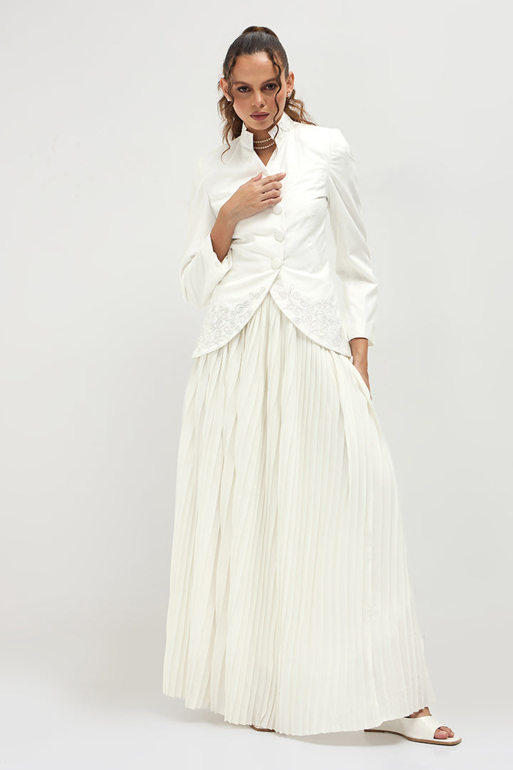 Structured Chinese-collar blazer with cord embroidery, styled with a pleated floor-length skirt in premium fabrics—perfect for formal gatherings and elegant evenings.