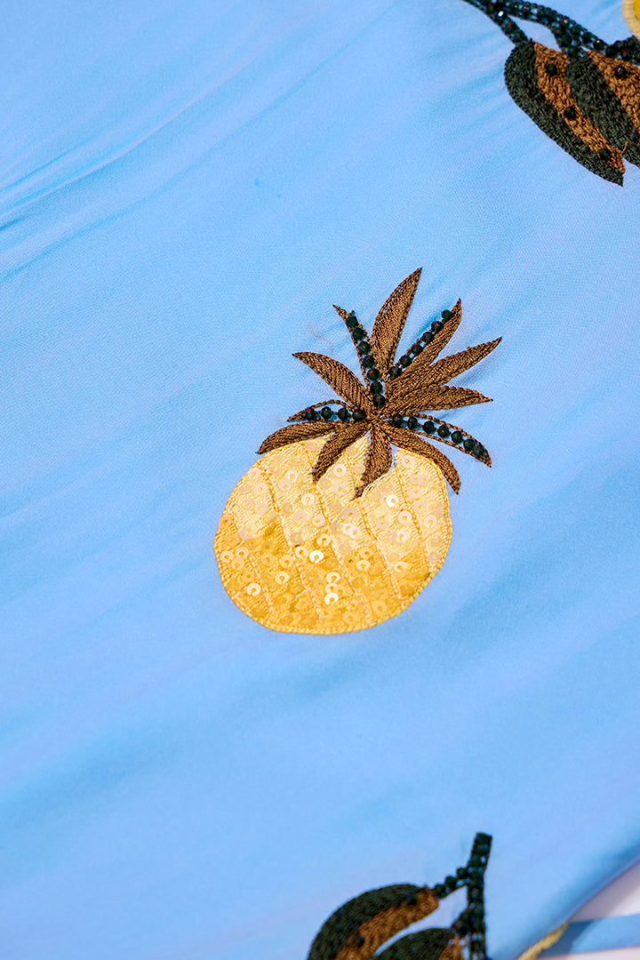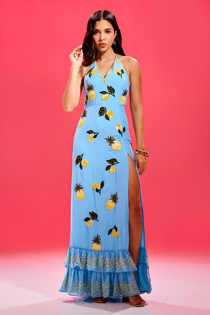 Flowing Capri Blue Silk Chiffon maxi halter dress, crafted for luxurious resort and evening moments. This breezy dress features a dramatic high side slit and is elevated by exquisite hand embroidery of pineapple and lemon motifs, using a mix of silk thread, sequins, and beads for a shimmering finish. Perfect for glamorous vacations and warm-weather power dressing.