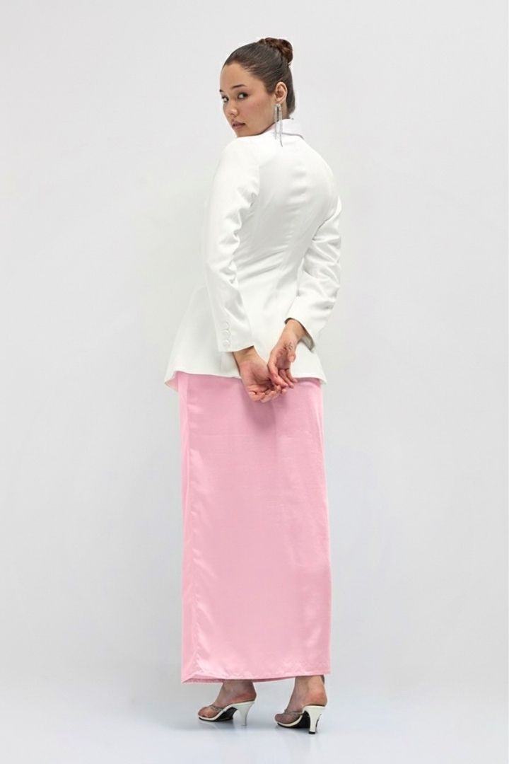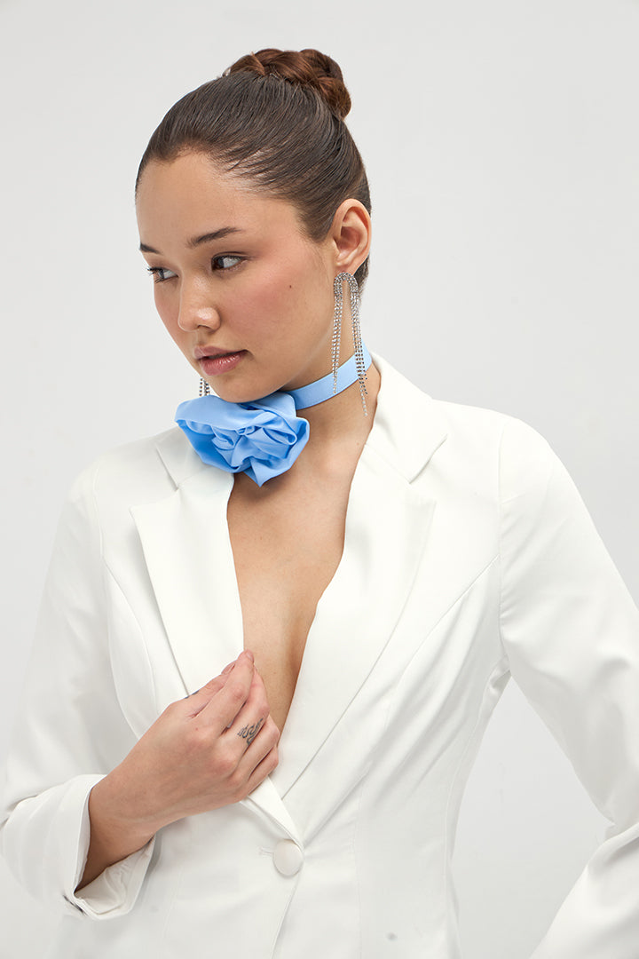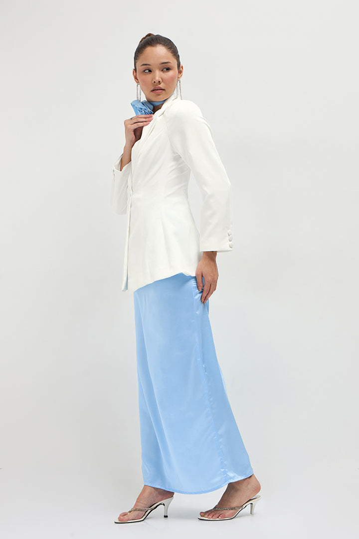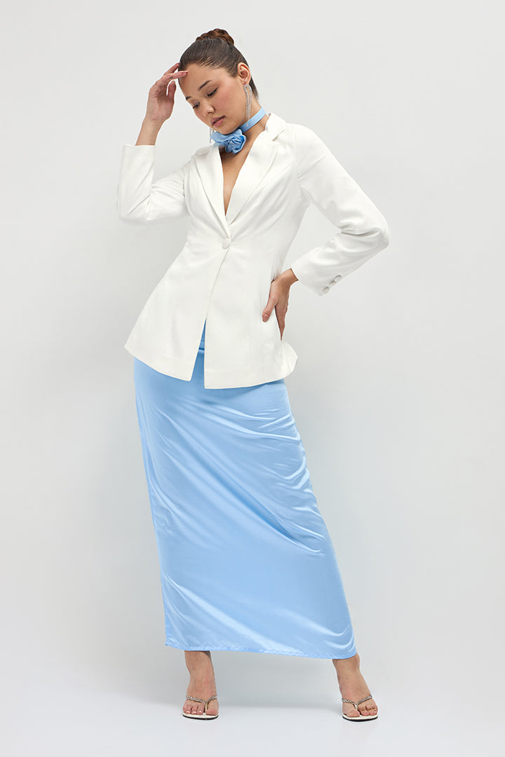 Tailored white blazer paired with a flowing sky-blue satin skirt, styled with a delicate satin neck band featuring a small floral detail. A refined ensemble made for brunches, day events, and semi-formal gatherings.