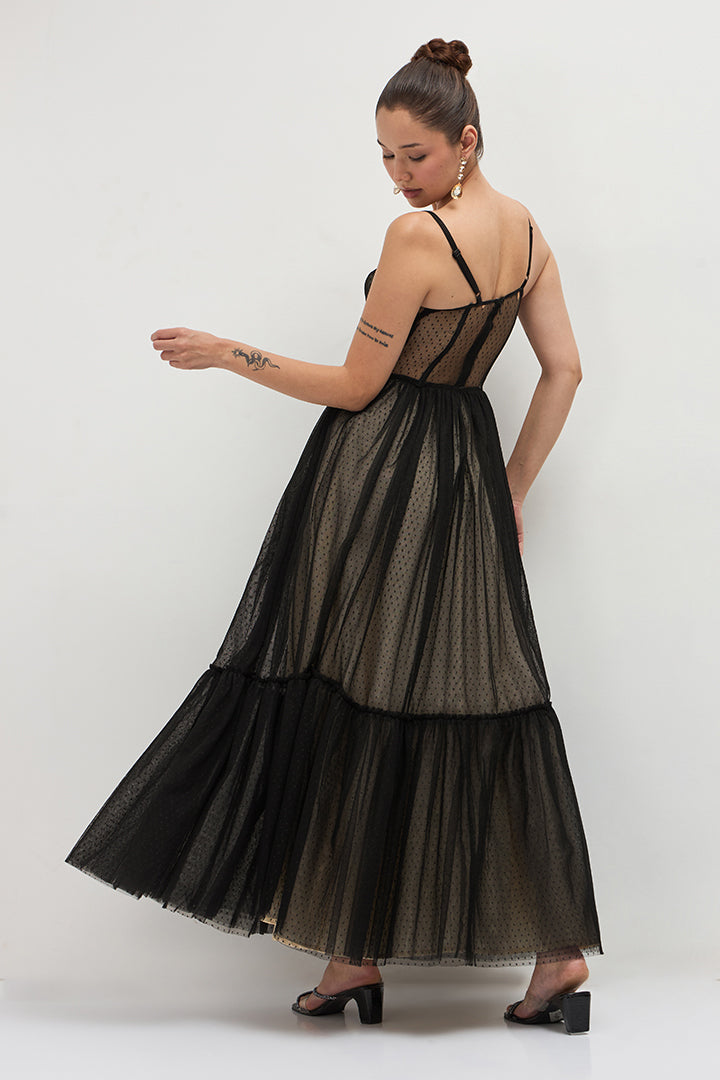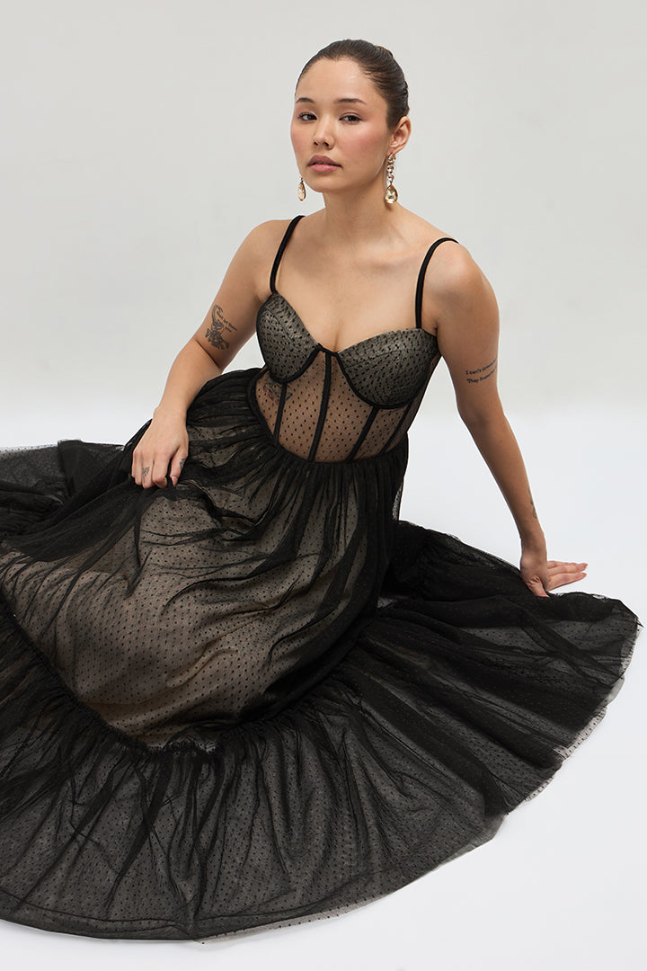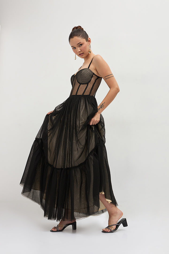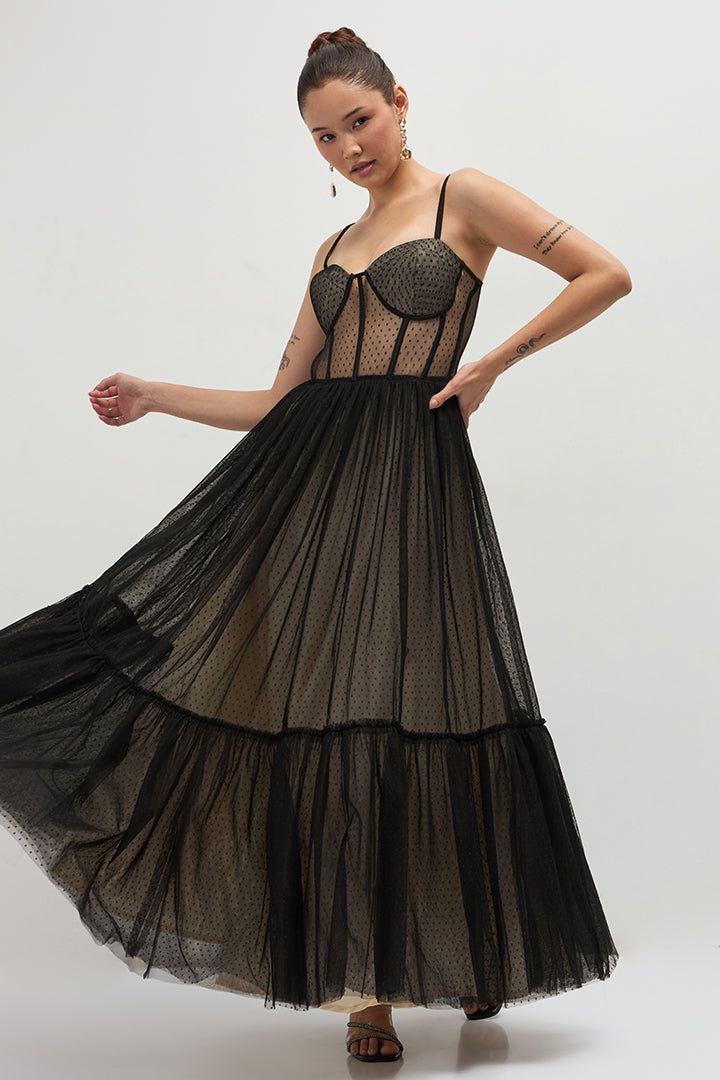 This dress combines elegance and allure in sinful black. Crafted from premium net fabric with polka dot design against nude lining. Features A-line silhouette with delicate spaghetti straps and ankle-length cut. Perfect for galas, weddings, and evening events.