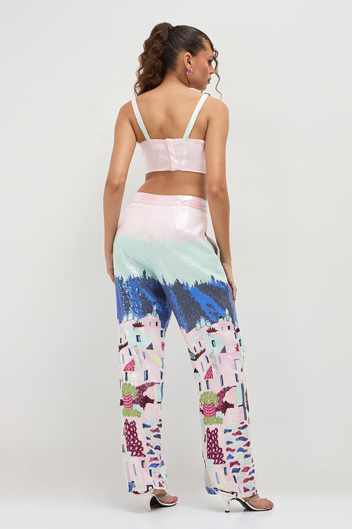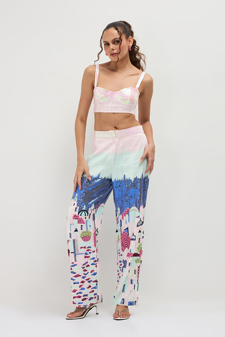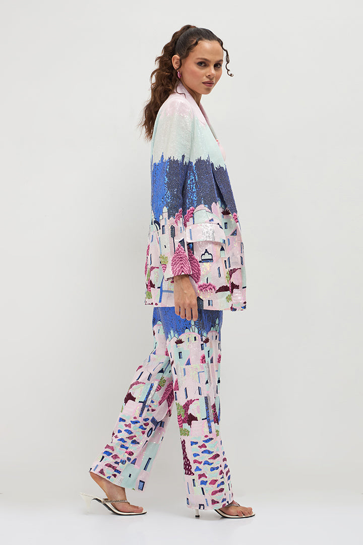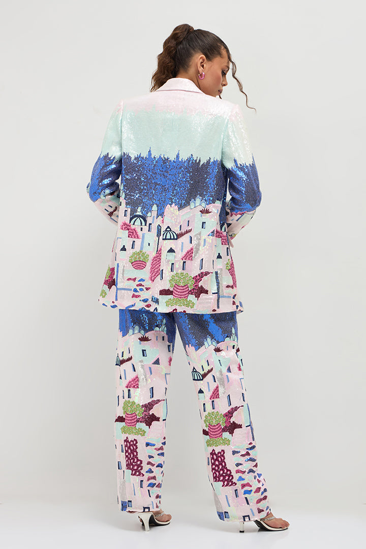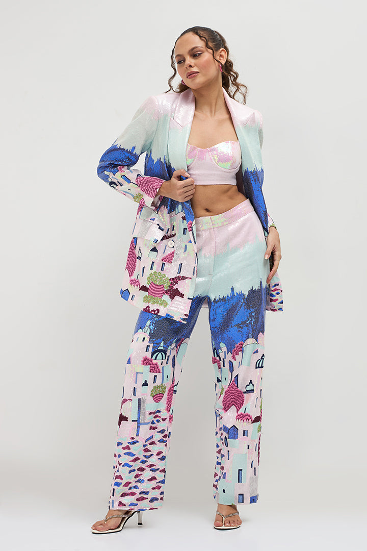 This versatile co-ords includes an oversized blazer dress, crop top, and pants, all featuring a stunning pink digital print. The blazer can be worn as a dress or layered over the crop top for a chic, put-together look. The crop top can also be worn alone or layered under the blazer, and features bejeweled strap accents and Ombre blue straps for an extra touch of glamour.