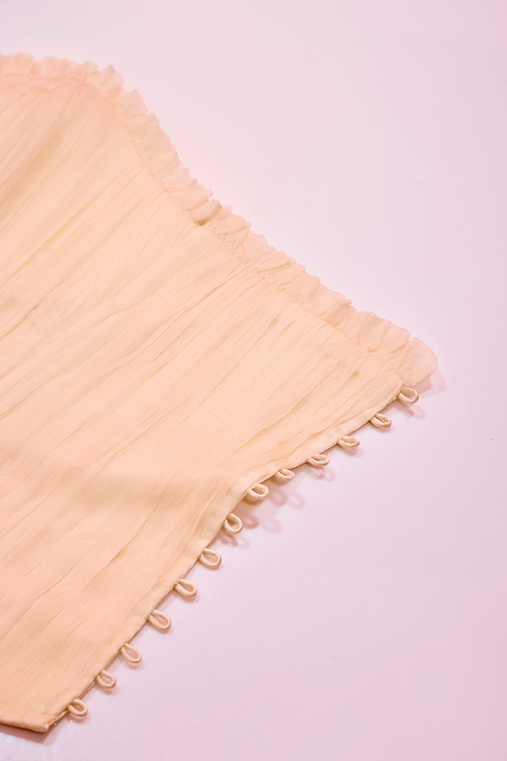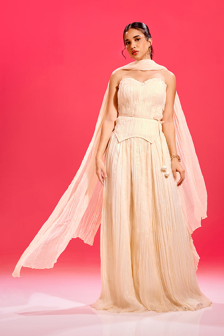 This enchanting three-piece ensemble is crafted from light, airy Silk Chiffon in a delicate Cream hue, featuring an all-over crushed or gathered texture. The off-shoulder top offers a structured, corset-style fit, complemented by a dramatic, flowing skirt and an ethereal, matching dupatta. The continuous texture across the set creates a glamorous, draped silhouette perfect for elevated events.